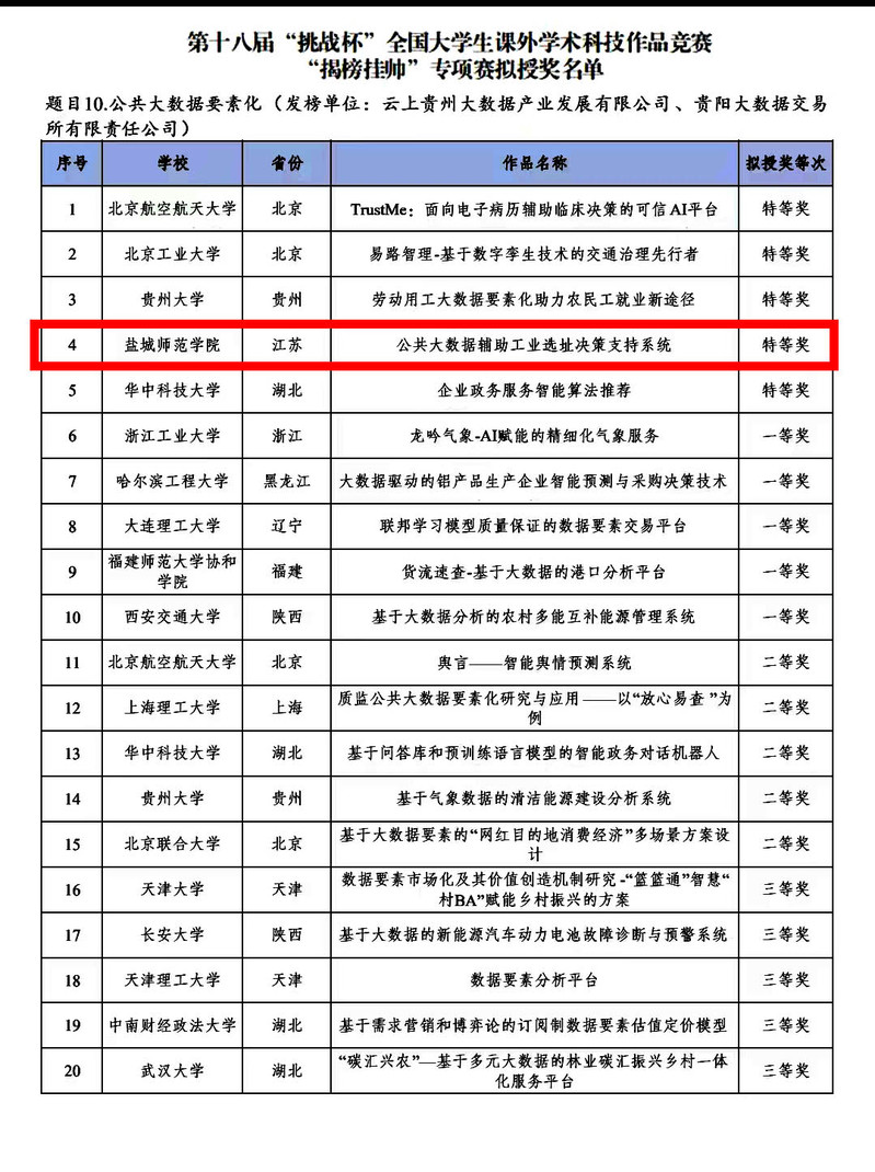 9月21日晚,第十八届“挑战杯”全国大学生课外学术科技作品竞赛“揭榜挂帅”专项赛拟授奖名单揭晓,beat365城市与规划学院选报的作品《公共大数据辅助工业选址决策支持系统》(指导教师:蒋海兵等)在终审决赛中荣获全国特等奖,这是beat365首次斩获该专项赛国赛特等奖,实现了beat365在该项赛事的突破。此外,beat365数学与统计学院选报的作品《高校就业困难毕业生就业现状、瓶颈及对策研究—以长三角地区为例》(指导教师:孙媛媛等)获得全国终审决赛二等奖。