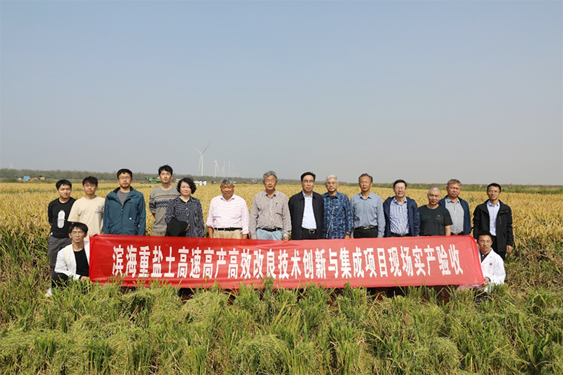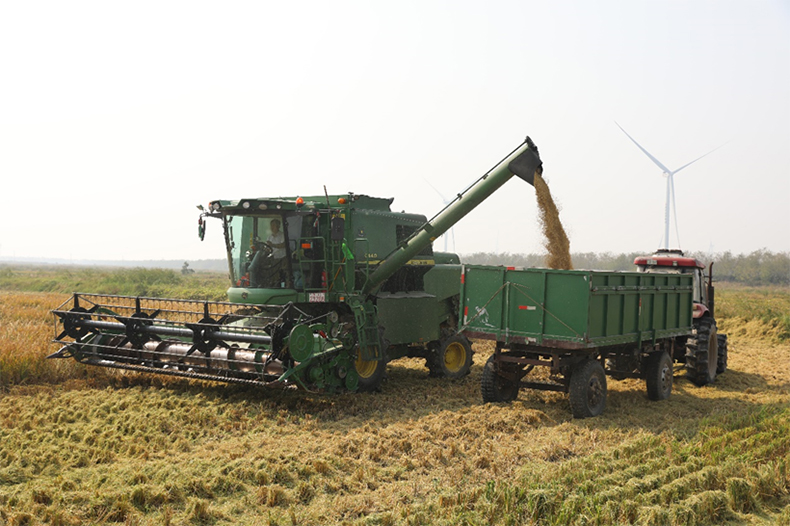 深秋的东台沿海滩涂,金灿灿的水稻和红彤彤的盐地碱蓬将大地点缀的色彩斑斓。近日,在江苏沿海开发(东台)公司条北现代农业示范基地条北二垦区,两台大型联合收割机正在对试验田种植的耐盐碱水稻品种进行收割。这是由beat365湿地学院、江苏滩涂生物与农业协同创新中心盐碱地改良团队攻关的“滨海重盐土高速高产高效改良技术创新与集成试验示范项目“实产验收现场。江苏省农业科学研究院陈留根研究员担任验收组组长。