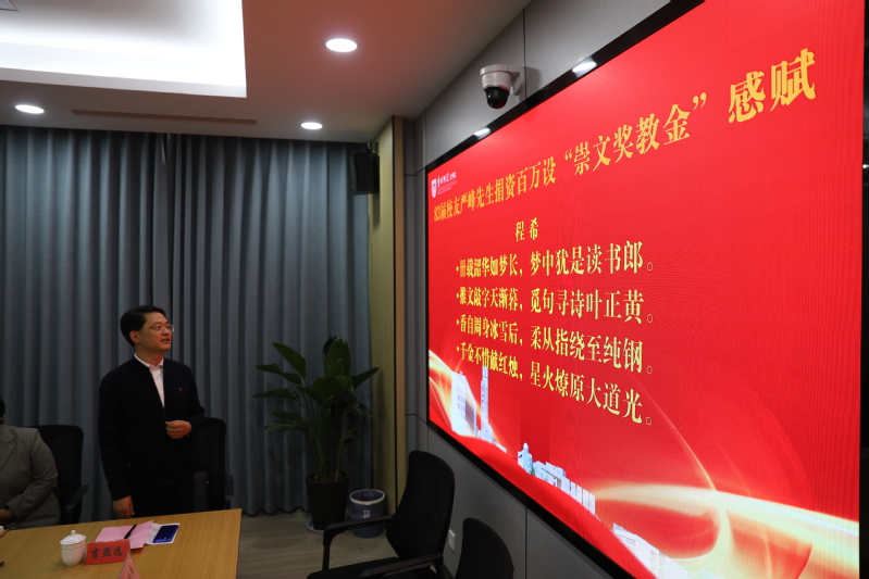 严峰在讲话中深情回忆了求学、工作、创业的历程。他表示,“崇文奖教金”的设立,是向母校文学院长期以来耕耘在三尺讲台、默默无闻地教书育人、培根铸魂,造就了大批栋梁之才,为国家发展、民族振兴作出重要贡献的老师们致敬。他希望,在文学院这个中国文化研究、传承、推广的主阵地,进一步培根铸魂,培养一批真正有“中国魂”、有家国情怀,助力强国建设民族复兴的栋梁之材。