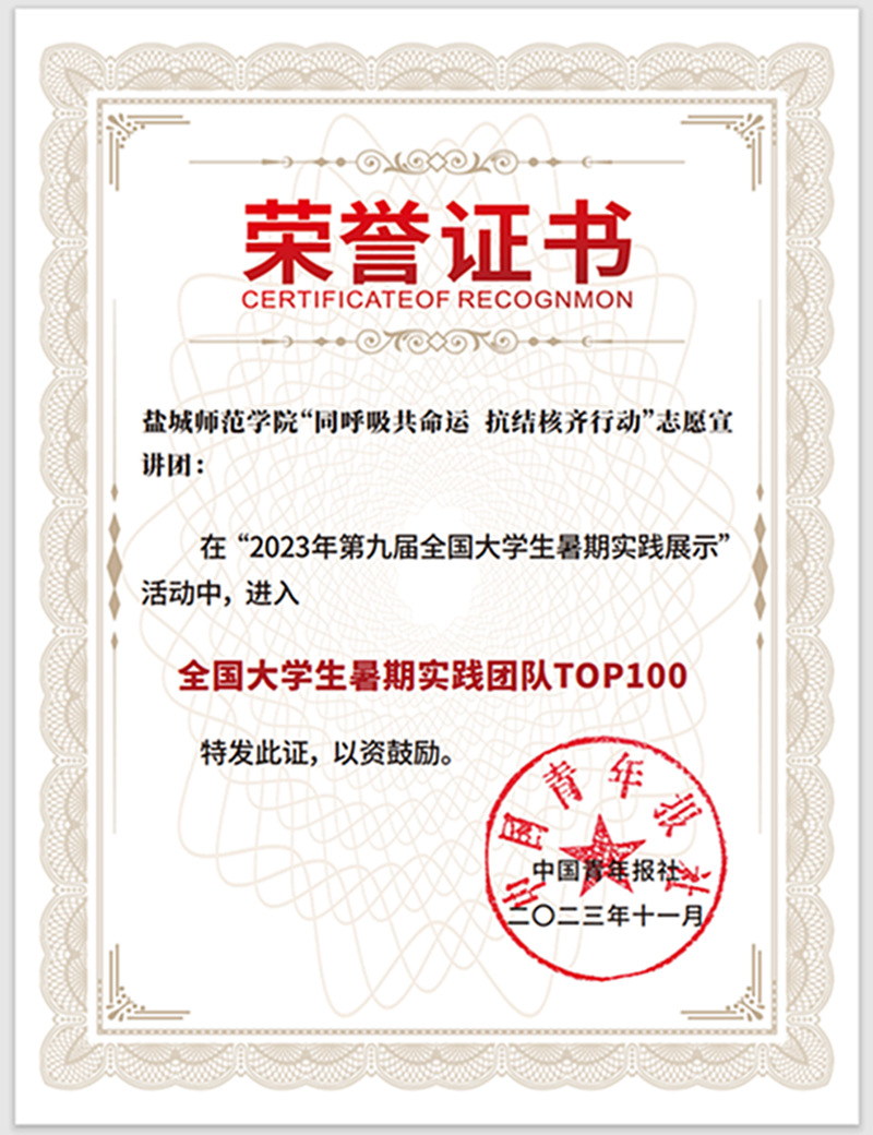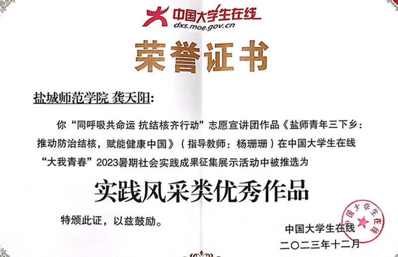 据悉,团队入选团中央2023年全国大学生“防治结核 志愿有我”志愿宣讲团,中国共青团杂志、江苏省学联官微《团学苏刊》《中国青年网》《盐阜大众报》《南通发布》等20余家主流媒体对实践活动进行了专题报道。