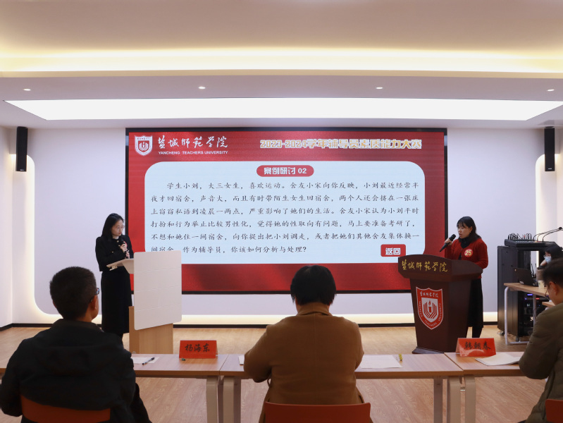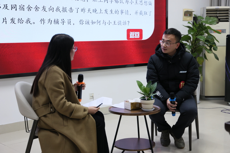 在谈心谈话环节,两位选手轮流充当辅导员或助演人员,通过情景模拟的方式重现辅导员与学生谈心谈话场景。在案例研讨环节,两位选手根据抽取案例轮流提问或作答,大家围绕学生工作常见案例,共同探讨问题本质、辨析原因、解决思路、实施办法及相关启示。