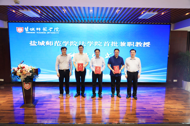 庞波、张桂华分别为法学院首批兼职教授夏锦文、张益刚和上海博和汉商(盐城)律师事务所主任卞国民颁发聘书。