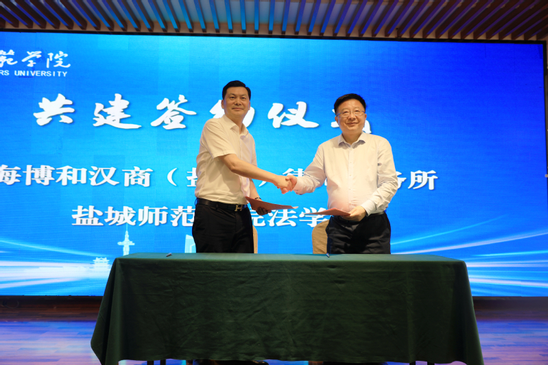 上海博和汉商(盐城)律师事务所主任卞国民与盐城师范学院法学院院长朱广东签订合作共建协议并为“上海博和汉商(盐城)律师事务所法学调研培训基地”和“盐城师范学院实践教育基地”揭牌。