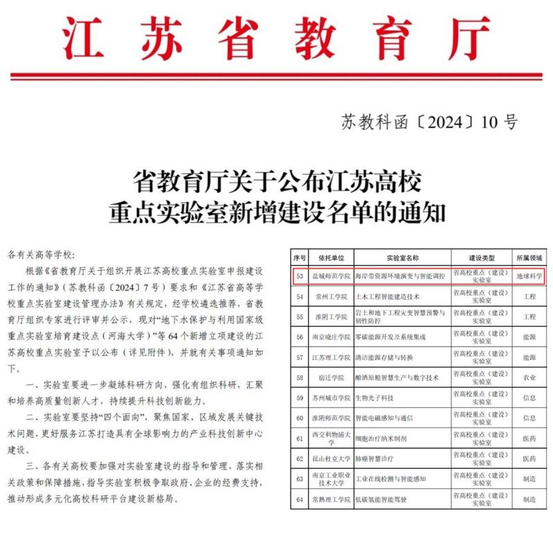 6月28日,江苏省教育厅公布2024年江苏高校重点实验室新增名单,beat365新增立项“海岸带资源环境演变与智能调控”省高校重点(建设)实验室1个。至此,beat365已拥有江苏高校重点实验室3个,其中国家级重点实验室培育建设点1个。