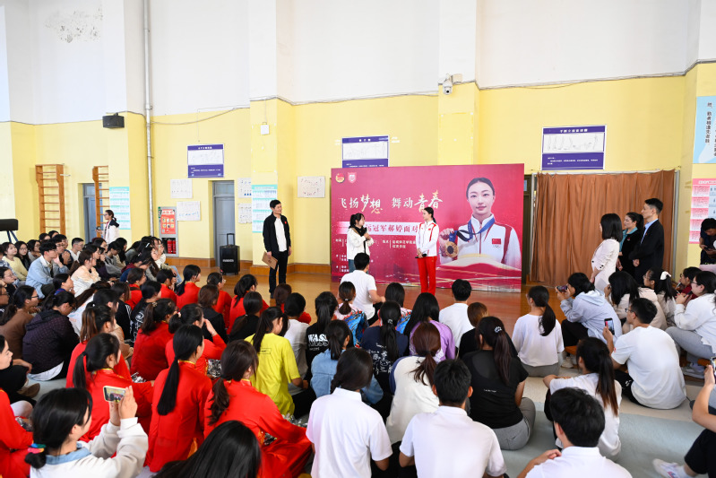 郝婷以“热爱、坚持、使命”三个关键词进行了主题分享,深情回顾了16年以来的训练心路历程,分享了自己如何在热爱与坚持下克服困难,最终站上最高领奖台的动人经历。正是这份热爱,让她在无数次挑战中找到前进的动力,不断迎难而上,乘风破浪。她鼓励盐师青年找到自己的目标和方向,坚守热爱,肩负时代使命,绽放青春风采。