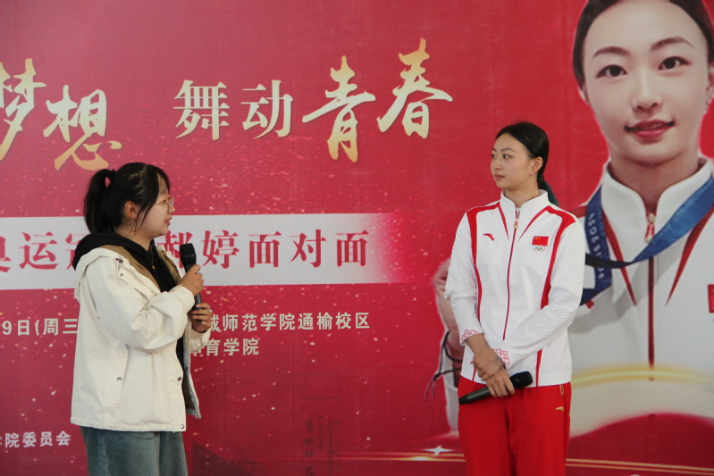 随后,郝婷来到体育学院,与广大体育专业学生现场交流。广大同学热情高涨,充满了对冠军的敬佩之情,大家围绕奥运冠军的台前幕后积极提问,郝婷一一给予解答。