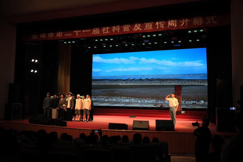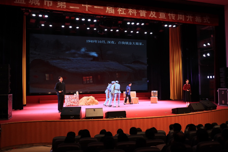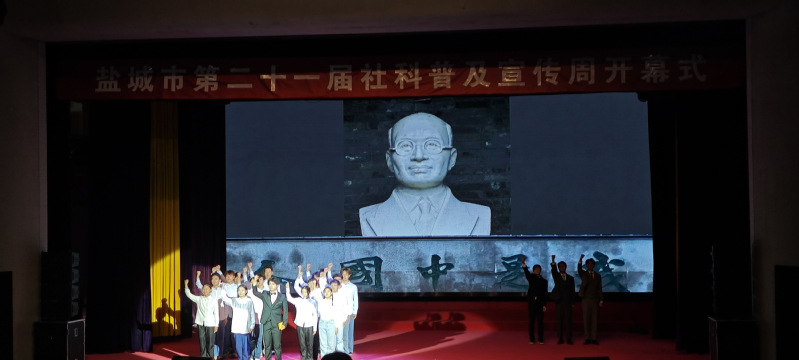本次社科普及宣传周主题为“赓续红色血脉 建设现代文明”。开幕式上,刘西忠、陈卫红、李兰翔、张宏如共同启动盐城市第二十一届社科普及宣传周,于建江向基地和学会代表赠书。文学院、江苏作家作品推广基地创作的多个原创社科普及活动在开幕式上展演。红色故事宣讲《一双雨靴》再现盐阜革命老区的鱼水深情。话剧《宋公堤》深情歌颂用生命赴使命的共产党人宋乃德修建海堤的革命事迹。跨越时空的对话《我是中国人》以中国新闻史学拓荒者戈公振为原型,讲述当代新闻人的责任与使命。文学院师生的诗朗诵《有一位女孩她曾经来过》生动演绎了中国第一位环保烈士徐秀娟感人故事。开幕式活动精彩纷呈,感人至深,观众反响热烈。