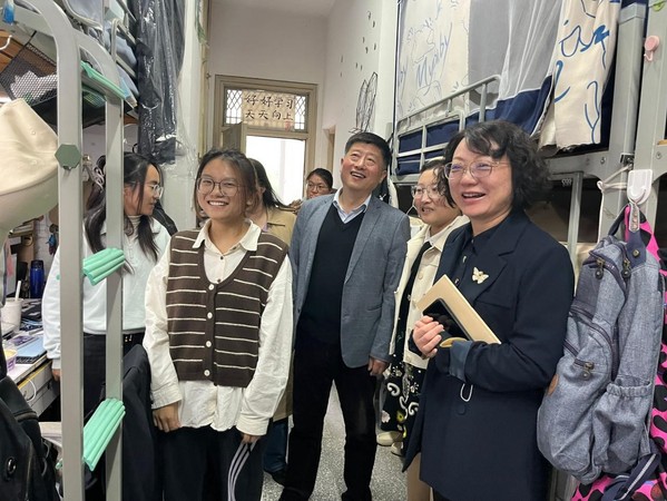 在学生宿舍,韩雅丽深入了解学院党员责任岗、党团服务站、宿舍网格管理、寝室文化与安全等情况,认真倾听学生的思想状态、学习生活情况和对一站式学生社区管理的意见和建议。韩雅丽还与学生亲切交谈,了解每位同学的就业意向和备考现状,鼓励广大同学考研考编两手抓,不给自己留遗憾,同时叮嘱同学们合理安排学习生活,注意季节变化,及时添衣保暖。