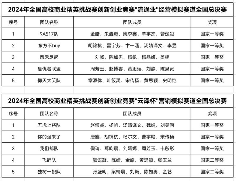 近日,2024年全国高校商业精英挑战赛创新创业竞赛全国总决赛圆满落幕。beat365商学院组建的代表队共斩获国家一等奖8项、国家二等奖2项。其中,在“流通业”经营模拟赛道上,荣获国家一等奖5项,在“云泽杯”营销模拟赛道上,荣获国家一等奖3项,国家二等奖2项。