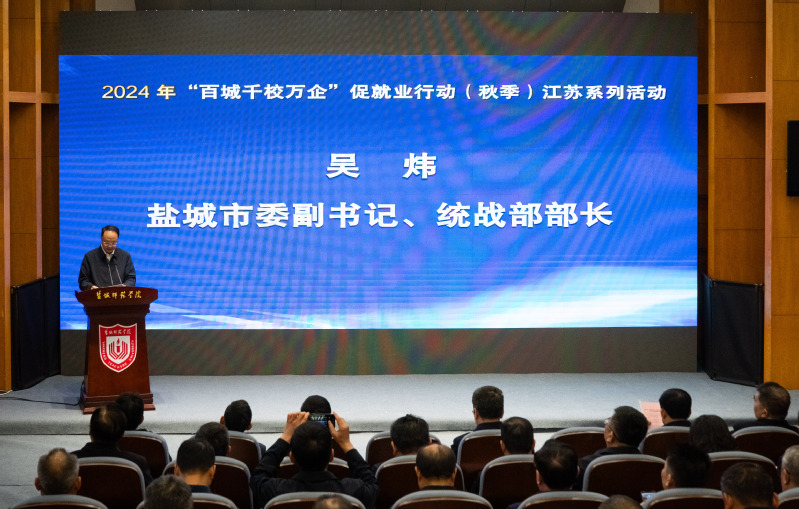 盐城市委副书记吴炜致辞,他表示盐城市在就业与人才工作方面取得了显著成效,民营企业吸纳就业主渠道作用凸显,形成了良好的人才生态和就业环境。未来,盐城市将继续深化人才强市战略,推动就业工作再上新台阶,为经济社会发展提供有力的人才保障和智力支撑。