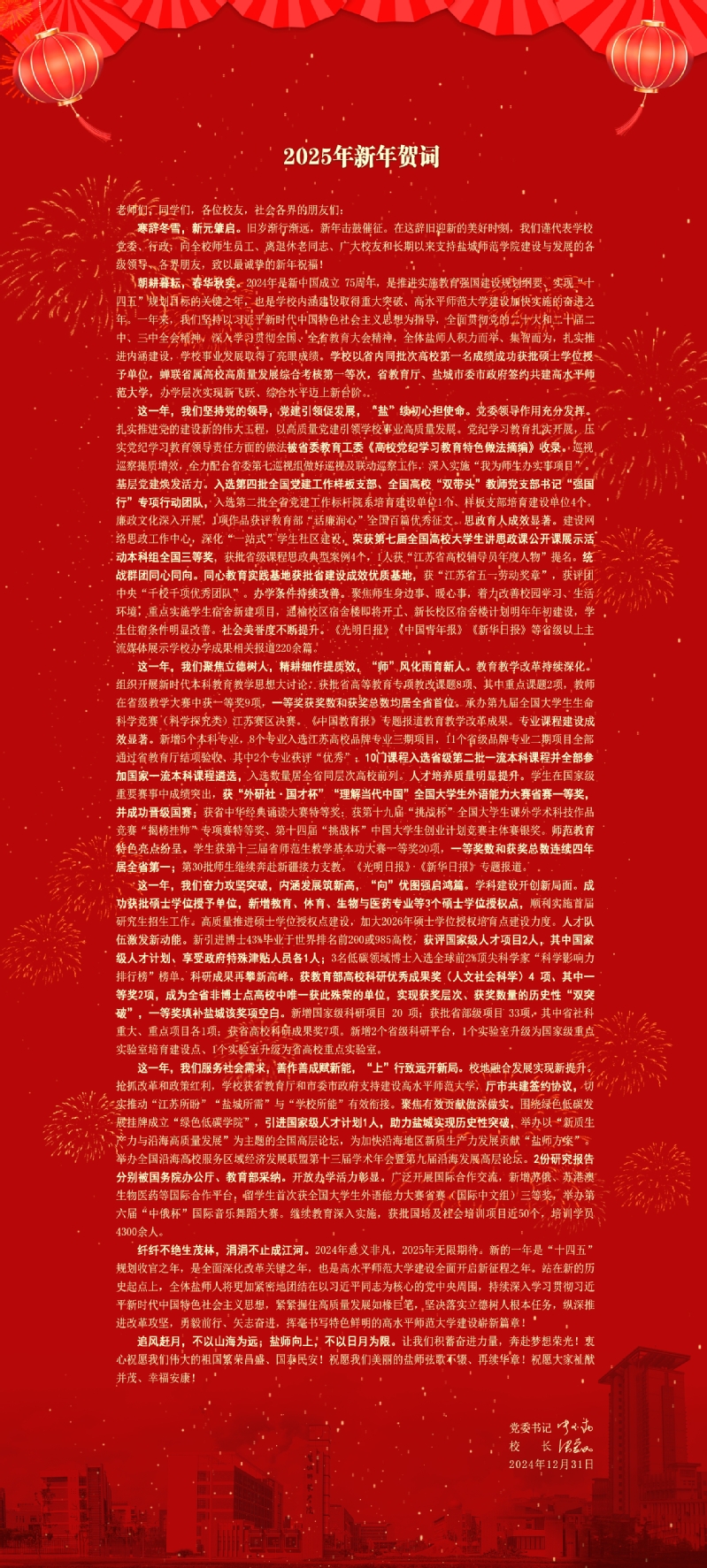 纤纤不绝生茂林,涓涓不止成江河。2024年意义非凡,2025年无限期待。新的一年是“十四五”规划收官之年,是全面深化改革关键之年,也是高水平师范大学建设全面开启新征程之年。站在新的历史起点上,全体盐师人将更加紧密地团结在以习近平同志为核心的党中央周围,持续深入学习贯彻习近平新时代中国特色社会主义思想,紧紧握住高质量发展如椽巨笔,坚决落实立德树人根本任务,纵深推进改革攻坚,勇毅前行、矢志奋进,挥毫书写特色鲜明的高水平师范大学建设崭新篇章!