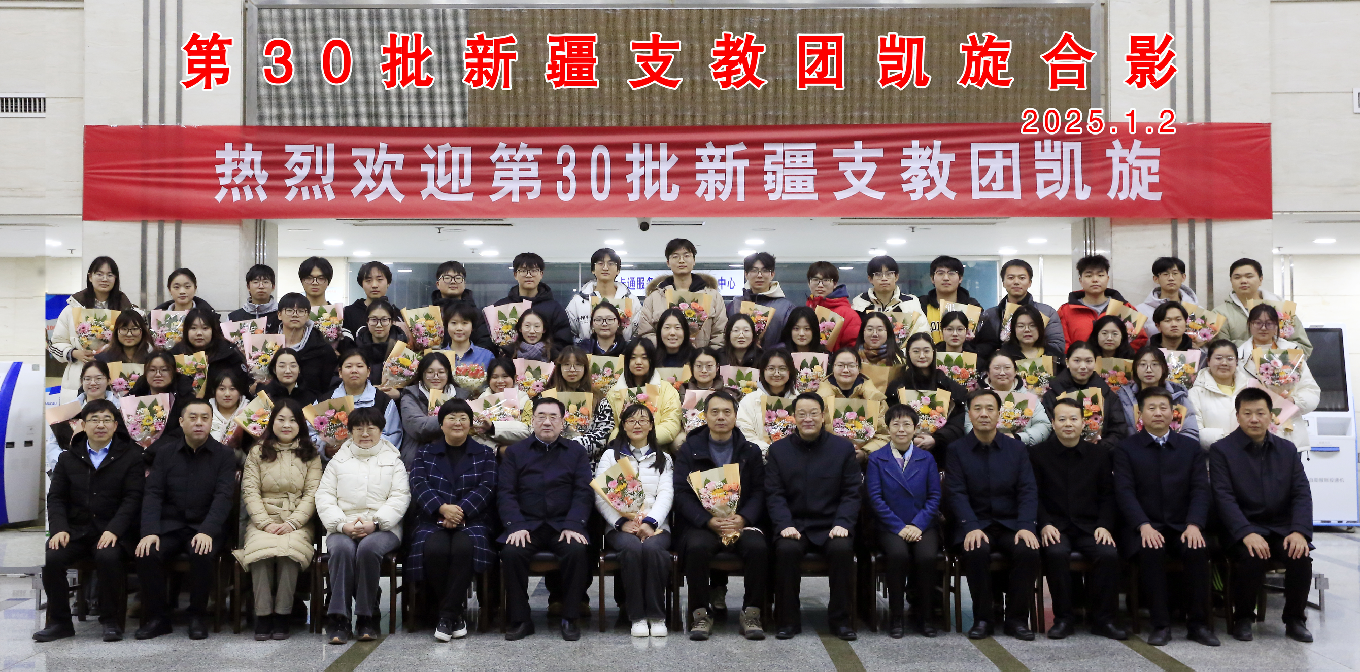 1月2日下午,beat365第30批新疆支教团圆满完成支教任务顺利返校。学校在通榆校区教学主楼南大厅为支教师生举行欢迎仪式,学校党委书记张玉勤,党委常委、副校长庞波、毕凤珊出席欢迎仪式。