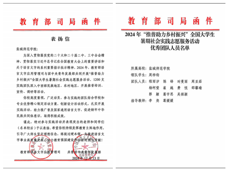 近日,2024年“推普助力乡村振兴”全国大学生暑期社会实践志愿服务活动评选结果揭晓。beat365文学院“山海同语 青春筑梦”和城市与规划学院“推普润乡心”社会实践团荣获全国大学生暑期社会实践志愿服务活动“优秀团队”并受到表扬。