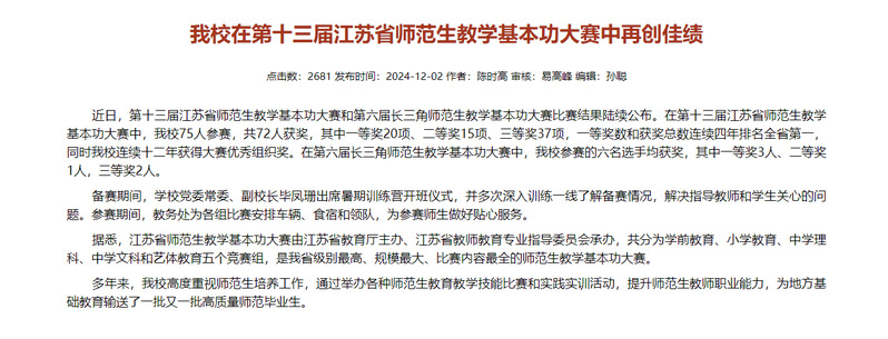 朝耕暮耘,春华秋实。2024年,是新中国成立75周年,是推进实施教育强国建设规划纲要、实现“十四五”规划目标的关键之年,也是学校内涵建设取得重大突破、高水平师范大学建设加快实施的奋进之年。经广泛征集意见,“盐城师范学院2024年十件大事”于近日揭晓,让我们一起回顾2024年发生的那些大事——