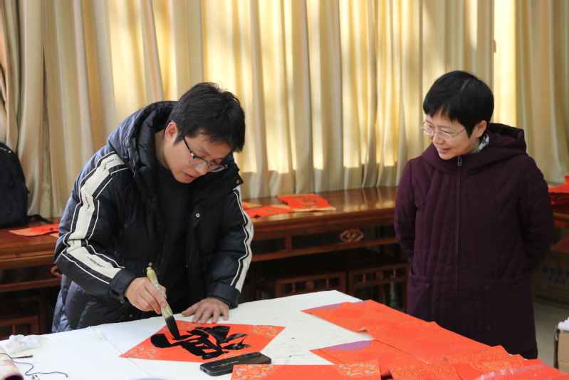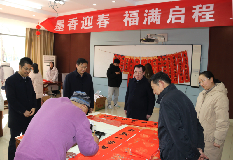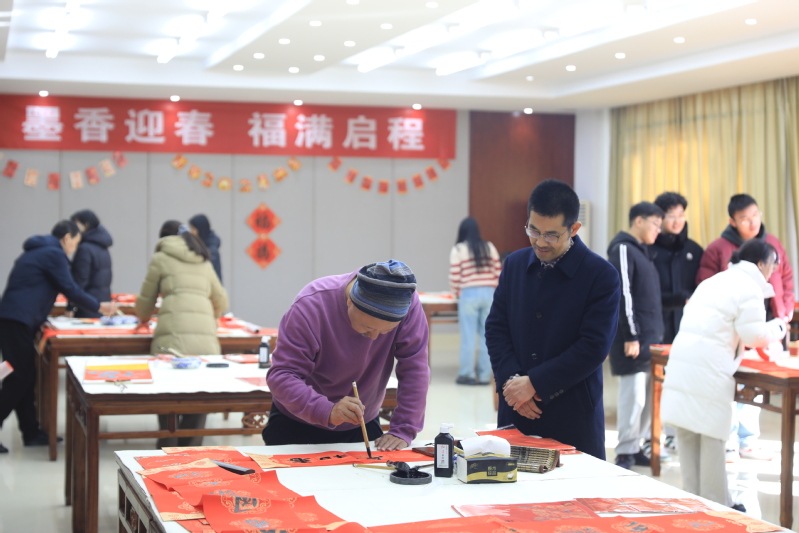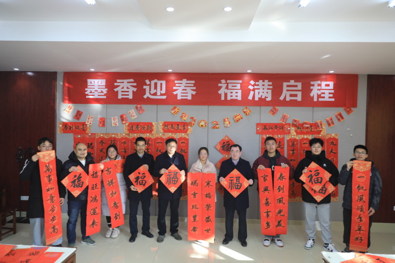 墨香迎春,福满启程。为营造浓厚春节氛围,传承中华传统书法文化,1月15日下午,学校党委宣传部联合校工会、离退休工作处、美术与设计学院在新长校区书画训练室开展写春联送祝福活动。学校党委常委、副校长庞波、张桂华、毕凤珊,副校长徐华到现场指导,并向师生送上美好的新年祝福。
