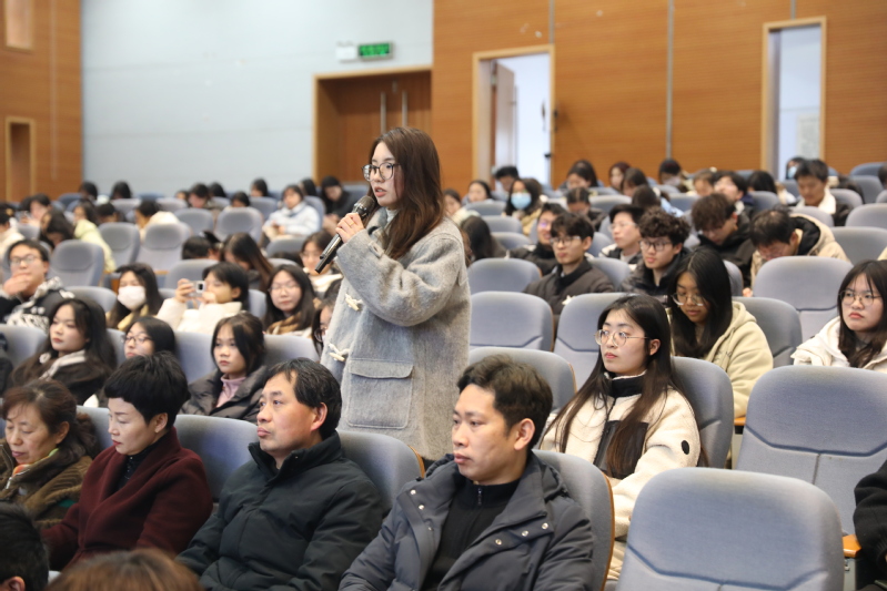 在互动环节,同学们积极提问,王老师就如何将思政教育“小课堂”和社会“大课堂”有效融合、如何应对新疆班同学心理健康问题等话题深入交流。她寄语青年学子到西部去、到基层去,让青春与时代同频共振。现场掌声雷动,师生纷纷为她“舍小我、赴大义”的精神所动容。