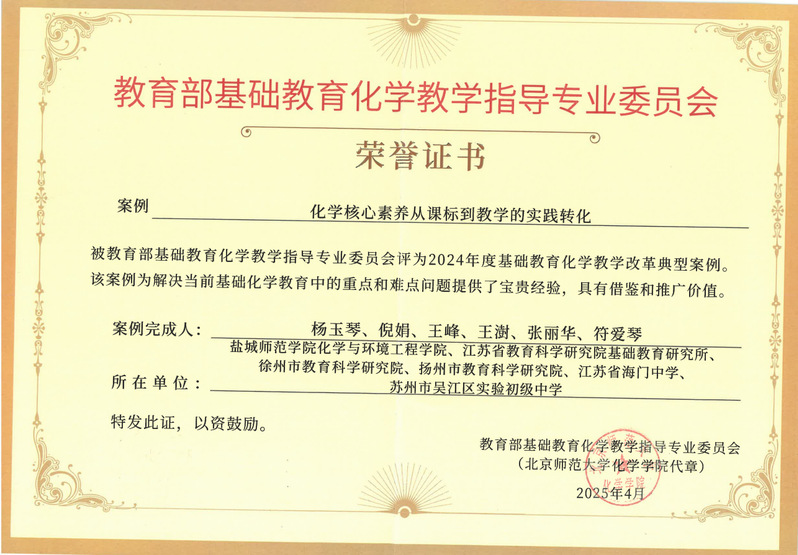 4月18日-21日,2025 年全国基础教育化学教学改革成果展示研讨会在郑州市第七高级中学举办。beat365化学与环境工程学院杨玉琴教授作为第一完成人的成果“化学核心素养从课标到教学的实践转化”经过两轮线上盲评、现场终评等环节,成功入选2024年度全国基础教育化学教学改革典型案例。