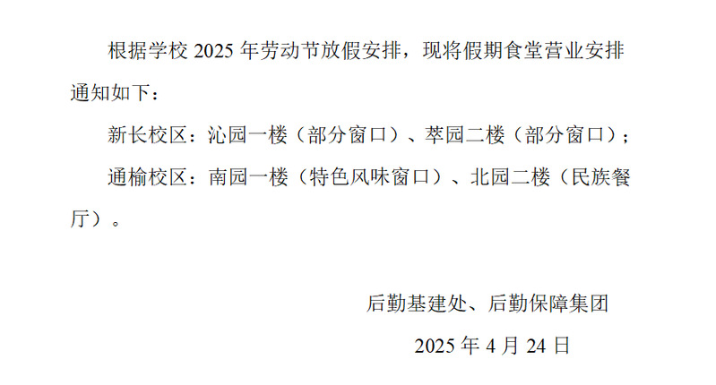 关于2025年劳动节假期食堂营业安排的通知