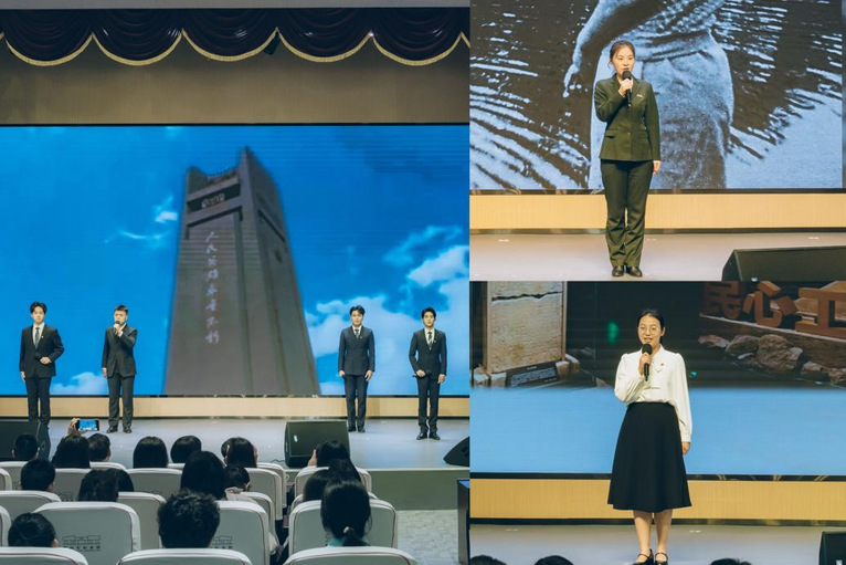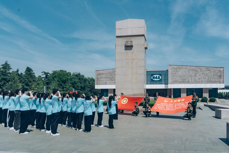 仪式结束后,团省委青年讲师团成员、盐城青年讲师团成员、新四军纪念馆讲解员潘晨霞带来红色故事《一件旗袍》,盐城师范学院青年讲师团成员颜丹晨同学宣讲《丰碑映初心,砥砺青云志》,青年讲师团成员冯昱岩等4位同学带来朗诵《英雄》。在纪念馆广场,beat365团委学生兼职副书记张子实同学带领青马工程学员重温入团誓词,发出最响亮的青春誓言。