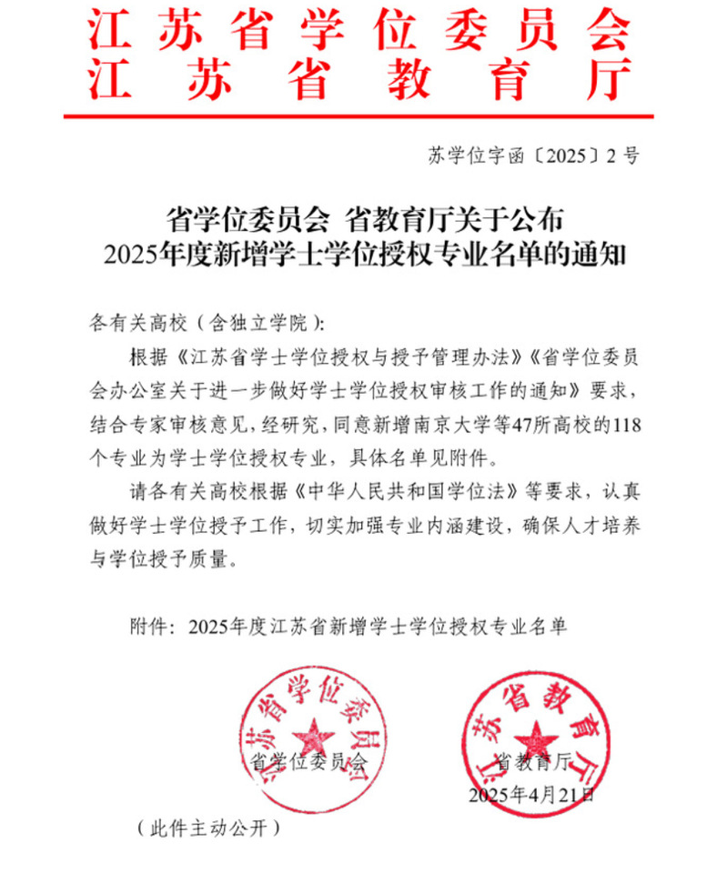近日,江苏省学位委员会、江苏省教育厅发布《关于公布2025年度新增学士学位授权专业名单的通知》(苏学位字函〔2025〕2号),beat365数字经济、信用风险管理与法律防控、食品营养与健康、应急管理4个专业顺利通过学士学位授权审核,获得学士学位授予权。