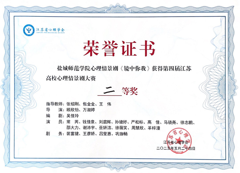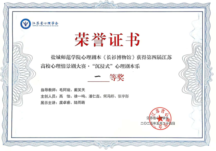 据悉,本次决赛由江苏省心理学会主办,江苏省心理学会艺术心理辅导与治疗专业委员会、大学生心理专业委员会、教学工作委员会及beat365共同承办。经过校级选拔、省级初赛、现场展演等环节的激烈角逐,beat365“沉浸式”心理剧本《长衫博物馆》和心理微剧场《三人行》荣获一等奖;舞台心理情景剧《镜中你我》和心理微剧场《不器之诗》荣获二等奖;舞台心理情景剧《拯救舍友大作战》荣获三等奖。