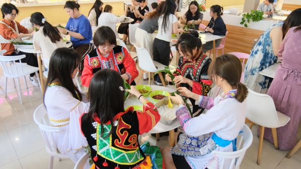 5月28日下午,人工智能学院联合后勤保障集团、国际合作与交流处举办“团结‘粽’情深 共庆迎端午”主题活动。百余名师生欢聚一堂共同包粽子、制香囊、书心愿。在包粽子体验区,粽叶飘香,欢声笑语不断。大家灵巧地将粽叶卷成漏斗状,放入糯米、红枣等馅料,再缠绕紧实。在手工香囊制作区,彩色棉布、艾草菖蒲、流苏穗子等材料整齐摆放,大家穿针引线,将对健康的期许缝进绣片。在“端午心愿区”,大家在印有水墨龙舟、荷花图案的卡片上写下对家人的思念、对学业的期许、对祖国的祝福。