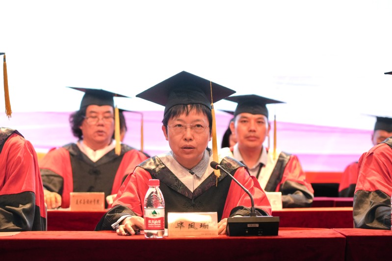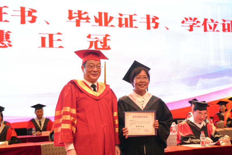 学校党委书记张玉勤为外国语学院陈立敏同学颁发“荣誉毕业生”证书、毕业证书和学位证书,并为其拨穗正冠。陈立敏作为一名57岁重返校园,拥有25年党龄的老党员,她勤奋学习,勇于实践,不断提升思想道德修养与文化科学素养,以非凡的毅力和执着精神,生动诠释了终身学习的深刻内涵。