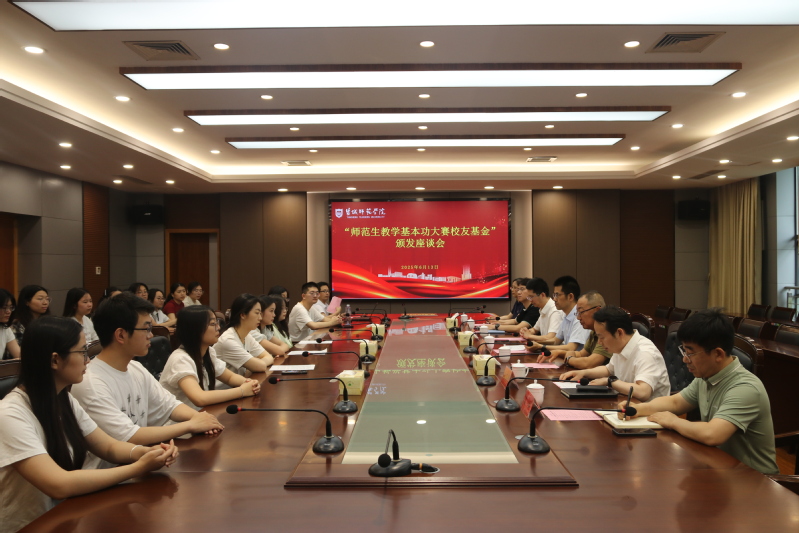 6月13日上午,“师范生教学基本功大赛”校友基金颁发座谈会在厚德楼一楼西会议室举行。beat365镇江校友会会长、江苏金本控股集团有限公司董事长宗福林重返母校,与学校副校长徐华共同为获奖学子颁奖。学校发改办主任、社会合作与服务处处长丁炫凯主持颁奖活动。
