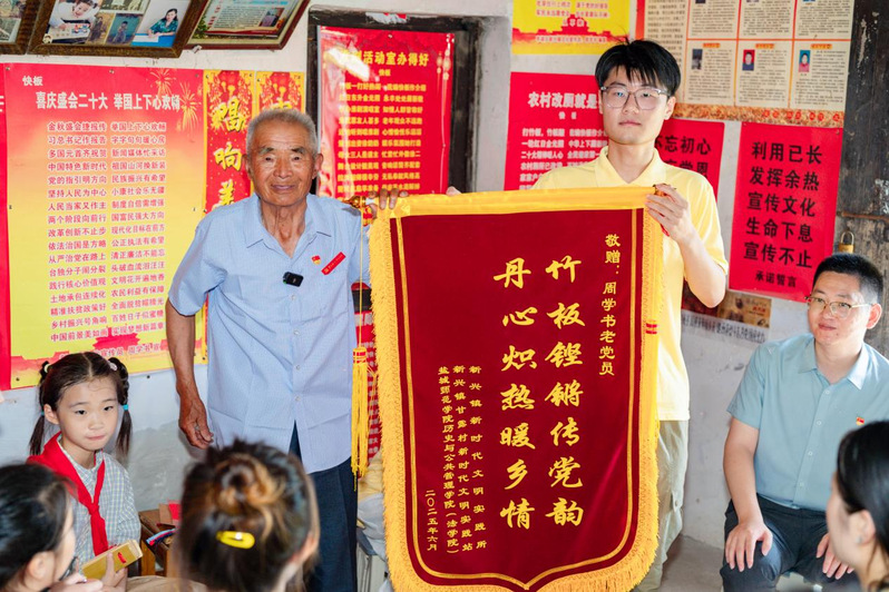 活动中,周学书深情回顾自己的入党初心,讲述在村干部岗位上尽职尽责的难忘经历,分享用快板传播党的创新理论的故事。他还现场表演了精心创作的歌颂党、倡导新风的快板作品,实践团成员积极跟学,并围绕宣传技巧、创作灵感来源以及如何在困难中坚守等话题,与周学书老人深入交流。学生代表还向周学书赠送了锦旗、书签以及一封满载敬意的书信,全体人员在信中向周学书表达了深深的感谢,并在他家中合影留念,将这堂难忘的“初心课”定格。