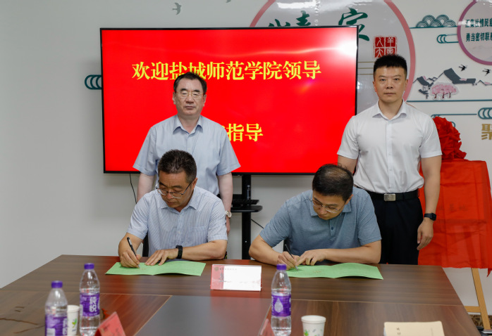 孙玉峰与羊寨镇党委书记、桃花源党工委书记李磊代表双方签署《盐城师范大学大学生就业基地协议书》,共同为“盐城师范学院大学生实习就业基地” 揭牌;学院党委副书记左飞与桃花源管委会主任张善民为 “盐城师范学院大学生社会实践基地” 揭牌。实践团学生代表周琳作表态发言。