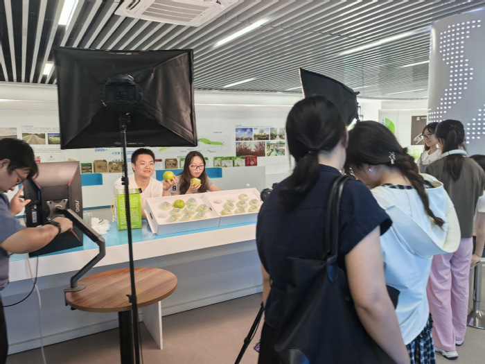 在桃花源林果交易中心,志愿者正有序开展直播助农活动。庞波与同学们深入交流,详细询问直播进展、遇到的困难及实践收获,对大家运用专业知识助力农产品销售的成效给予肯定,勉励同学们继续探索创新助农路径。