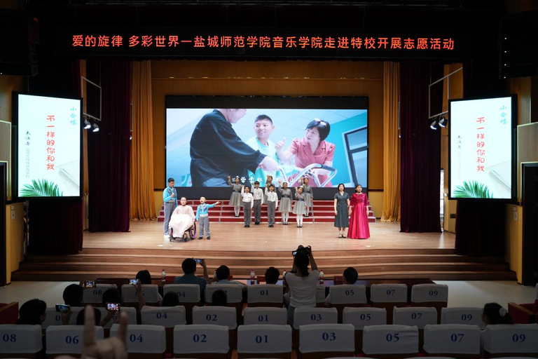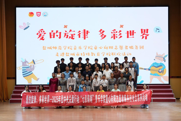 近日,音乐学院“童心向阳志愿者服务团”走进盐城市特殊教育学校开展“爱的旋律,多彩世界”主题暑期社会实践活动。两校师生以音乐为桥梁,传递爱与温暖,共同开启一场充满温情的交流之旅。