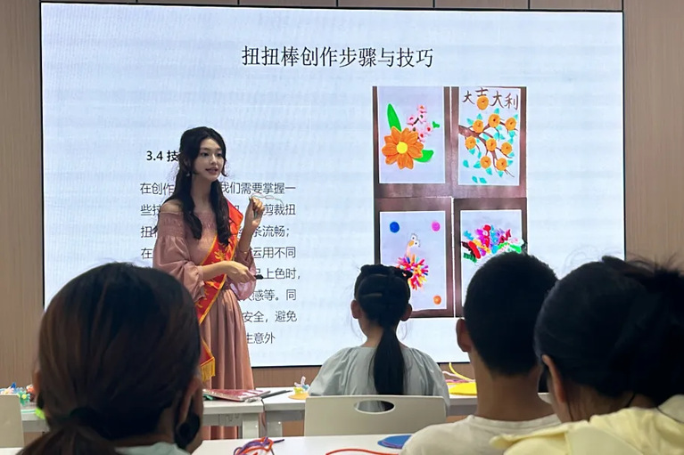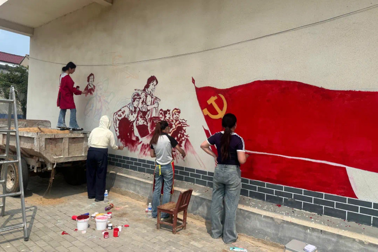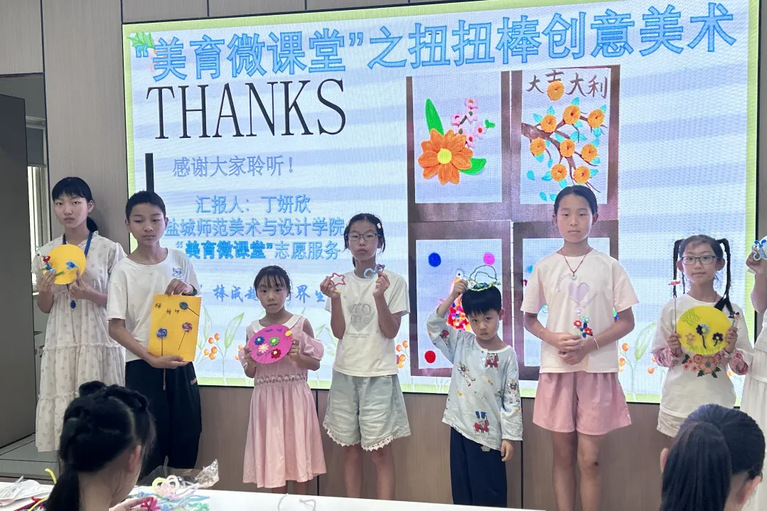 在太仓市伟阳社区新时代文明实践站,艺科238班丁妍欣同学为孩子们带来扭扭棒创意美术课。活动中,她将平平无奇的扭扭棒通过弯折、缠绕、组合等简单动作,便能变身为娇艳花朵、灵动动物。她结合实例讲述扭扭棒艺术如何突破传统绘画边界,让创作摆脱纸笔束缚。在连云港市赣榆区黑林镇大树村,美术师范231班张静怡同学带领“墙绘乡村”社会实践团围绕“幸福是奋斗出来的”主题创作墙绘,将奋斗场景与党旗元素融入画面,既美化乡村环境、提升乡风文明,又贴合当地特色观光旅游路线,为乡村增添红色文化氛围。