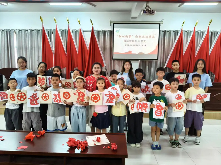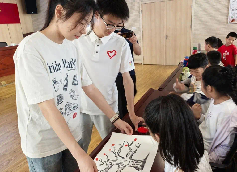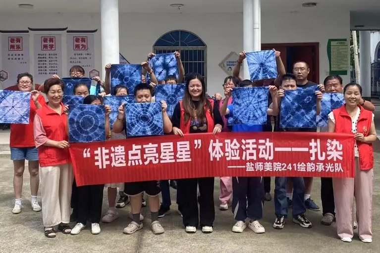 美术师范241班团支部组建的“绘韵承光”社会实践团,走进江苏省常熟市支塘镇残疾人活动中心为残疾人士开展非遗扎染文化传播课程。团队成员高岚和谭可如卉生动讲述扎染千年历程,详解“扎、缝、染、拆”工序,同时细心准备防滑工作台、大字号步骤图等教学工具,设计简化技法让残疾人士在指尖与染料的交融中触摸到传统技艺的温度。在盐城市射阳县合东党群服务中心的公益暑托班中,学院志愿者联合剪纸非遗传承人共同设计“红船精神”“英雄人物”等红色剪纸课程,通过课程设计与心理辅导,帮助孩子们在学习剪纸技巧的同时,感悟红色文化。