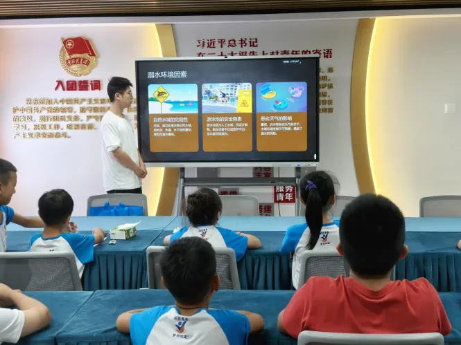在盐城市大丰社区党群服务中心的活动室,数24(4)统计班孙宇宸同学的防溺水安全教育课没有直接念安全守则,而是先给孩子们看了一段模拟动画,展示平静湖面下可能存在的暗流,以及泳池边缘瓷砖的湿滑程度。孩子们分组扮演“救生员”和“落水者”,用竹竿模拟互相拉扯,练习“不下水救人”的技巧。