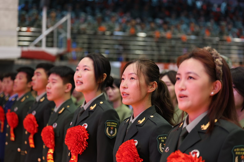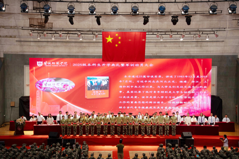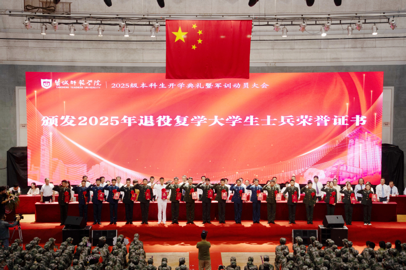校领导还为积极响应国家号召携笔从戎、报效祖国,用热血书写无悔青春的2025年退役复学大学生士兵代表颁发荣誉证书,并向2025级新生代表赠送《习近平和大学生朋友们》和盐城师范学院校徽,祝贺他们成为“盐师人”。典礼在齐唱盐城师范学院校歌中落下帷幕。