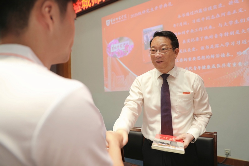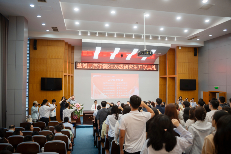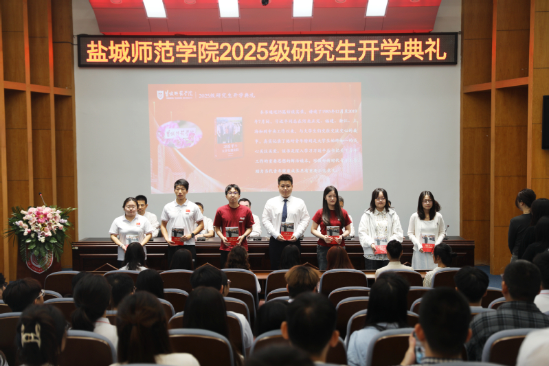 校领导向全体2025级研究生新生代表赠送书籍《习近平和大学生朋友们》和盐城师范学院校徽,祝贺他们成为“盐师人”。全体研究生新生庄严宣誓。典礼在齐唱盐城师范学院校歌中落下帷幕。