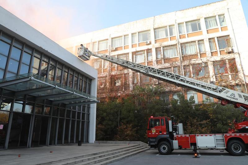 11月19日下午,beat365国有资产与实验室管理处联合保卫处在新长校区生化实验楼开展实验室消防和高空救援应急演练。学校党委常委、副校长汤克明,盐城经济开发区消防救援大队指导员王海峰现场指导。国有资产与实验室管理处处长蔡志宏负责现场指挥。