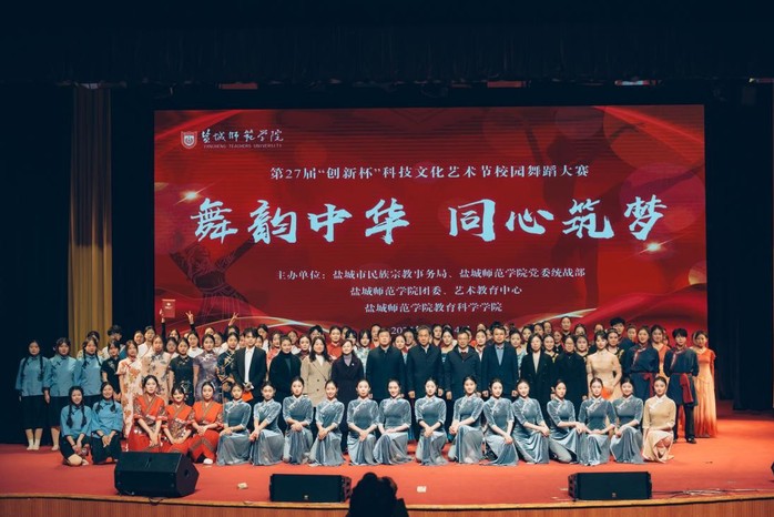 1214日,第27创新杯科技文化艺术节之舞韵中华,同心筑梦校园舞蹈大赛在新长校区大学生活动中心举办。学校副校长徐华,盐城市委统战部副部长、市民宗局局长、党组书记、一级调研员黄斌,市民族和宗教事务局党组成员、副局长陈铁汉,市民族和宗教事务局党组成员、副局长王谋等领导出席活动。