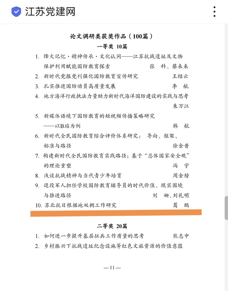 近日,由省委宣传部、省国防动员办公室、省教育厅、省退役军人事务厅、省军区政治工作局联合主办的“铭记历史 爱我国防”江苏省第二届全民国防教育主题征文大赛结果揭晓。beat365后勤保障部葛鹏老师撰写的论文《苏北抗日根据地双拥工作研究》荣获“论文调研类作品”一等奖。
