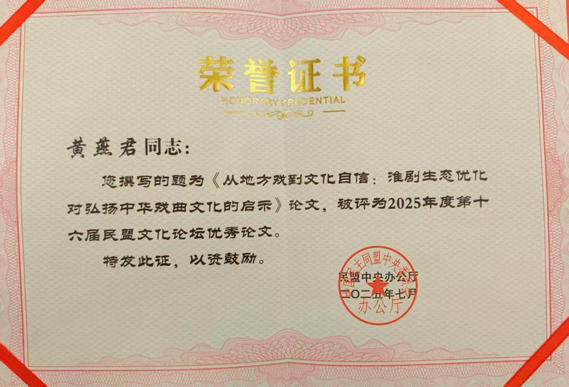 黄燕君博士作为新盟员,自2024年11月加入校民盟基层委员会以来,持续深耕文化研究与统战理论相结合的领域。此前,她撰写的《从地方戏到文化自信:淮剧生态优化对弘扬中华戏曲文化的启示》一文获第十六届民盟文化论坛优秀论文;《“美美与共”的先声:费孝通广西民族关系研究与民盟“中华民族共同体”话语建构》一文入选“金山秀水·美美与共”第十二届费孝通学术思想研讨会《费孝通与民盟》论文集。