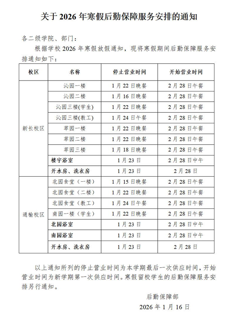 关于2026年寒假后勤保障服务安排的通知