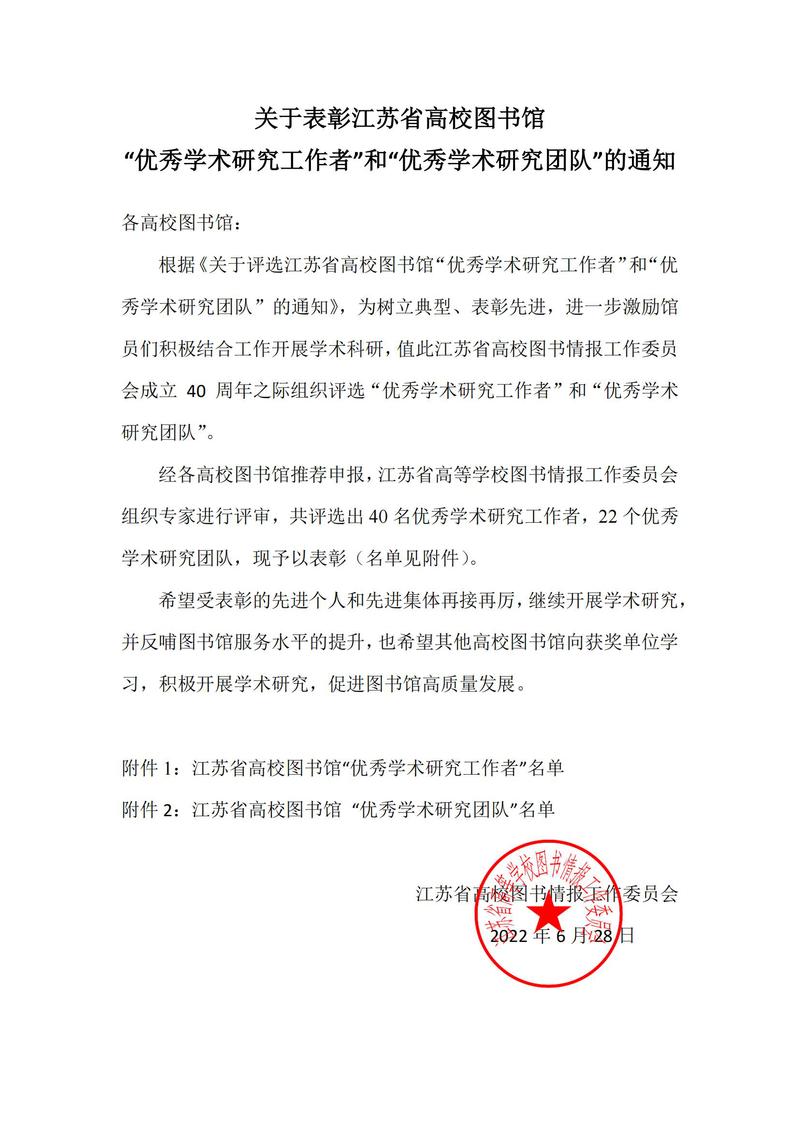 为树立典型、表彰先进,进一步激励图书馆馆员积极结合工作开展学术科研,今年,江苏省高校图书情报工作委员会首次开展江苏省高校图书馆“优秀学术研究团队”“优秀学术研究工作者”评选活动,对2011年以来学术研究取得突出成绩的团队及个人进行表彰。经各高校图书馆推荐申报,江苏省高等学校图书情报工作委员会组织专家进行评审,共评选出22个优秀学术研究团队,40名优秀学术研究工作者,其中beat365图书馆被表彰为江苏省高校图书馆“...