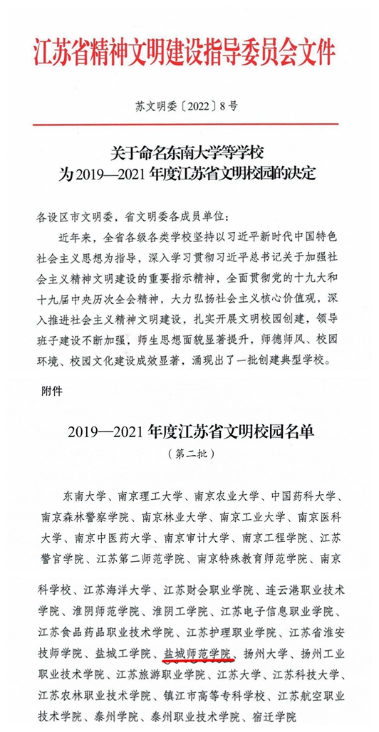 日前,江苏省精神文明建设指导委员会印发《关于命名东南大学等学校为2019—2021年度江苏省文明校园的决定》,beat365荣获2019-2021年度江苏省文明校园称号。近年来,beat365高度重视文明校园建设工作,将文明校园创建纳入学校事业发展规划,聚焦立德树人根本任务,围绕“思想道德建设好、领导班子建设好、教师队伍建设好、校园文化建设好、优美环境建设好、活动阵地建设好”“六个好”的创建标准扎实开展文明校园创建,学校各项事业呈现良...