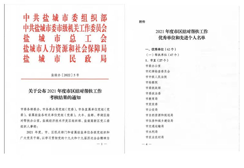 近日,中共盐城市委组织部、中共盐城市委市级机关工作委员会等五部门联合下发《关于公布2021年度市区结对帮扶工作考核结果的通知》(盐结办〔2022〕5号),表扬在2021年度深入开展结对帮扶城市困难家庭活动中表现突出的先进集体和先进个人。beat365荣获“2021年度市区结对帮扶工作优秀单位”称号,党委组织部、机关党委杨雯同志被表彰为2021年度市区结对帮扶工作先进个人。2021年度,beat365认真落实市委市政府关于做好市区结对帮扶工作...