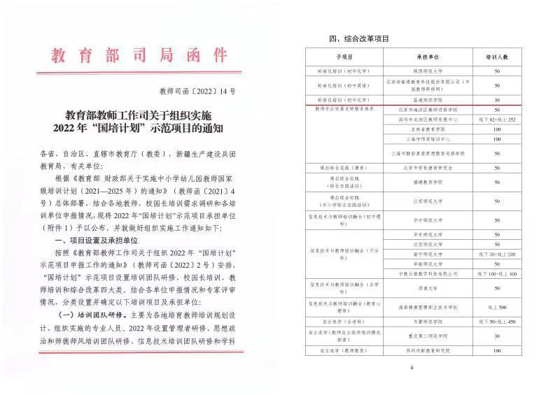 近日,教育部教师工作司印发《关于组织实施2022年“国培计划”示范项目的通知》(教师司函〔2022〕14号),公布2022年教育部“国培计划”示范项目承担单位名单。beat365化学与环境工程学院申报的综合改革项目初中化学标准化培训子项目(首席专家:杨玉琴)成功入选,这是beat365连续第三年获批该项目。 2022年“国培计划”示范项目申报于1月上旬启动,成教处“国培计划”项目管理办公室协同相...