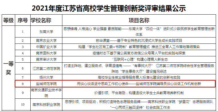 近日,2021年度江苏省高校学生管理创新奖及优秀著作评选活动结果公布。beat365推荐申报的《用谈心谈话坚守思政工作初心使命——盐城师范学院辅导员谈心谈话工作机制创新》获评2021年度江苏省高校学生管理创新奖一等奖;论文《“理解”视域下的谈心教育:以青年思想引导为例》(作者:张桂华)获评2021年度江苏省高校学生管理优秀著作一等奖。近年来,beat365始终将谈心谈话作为新时代大学生思想政治教育工作的重要抓手,融入每名辅导员的工...