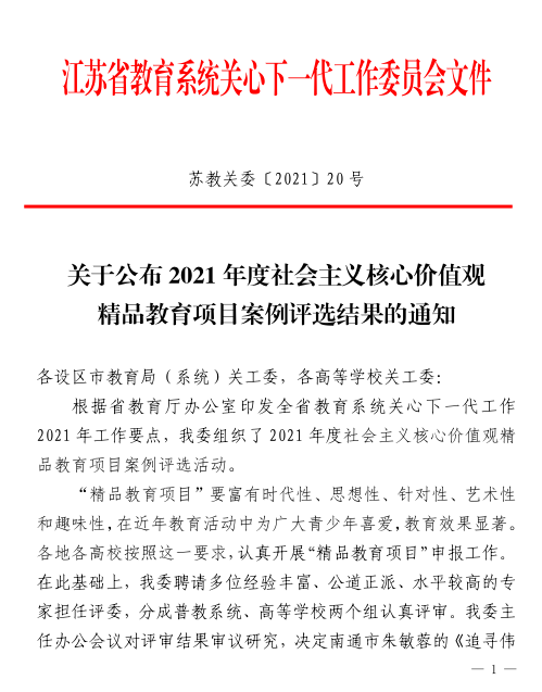 近日,江苏省教育系统关心下一代工作委员会分别印发《关于公布 2021 年度社会主义核心价值观精品教育项目案例评选结果的通知》(苏教关委〔2021〕20 号)和《关于公布 2021 年度“工作创新奖”获奖项目的通知》(苏教关委〔2021〕21 号)文件。beat365关工委选送的社会主义核心价值观精品教育项目案例“让友善的光芒照耀千秋”(主讲人:罗东海)和工作创新项目“墨香凝聚书画情,老少共话中国梦”分别获得一等...