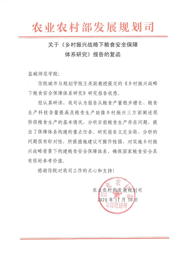坐标网讯 2020年,城市与规划学院充分发挥学科平台优势,致力于服务国家乡村振兴战略,助推城乡融合发展,重点打造“把论文写在祖国大地上”科研团队。今年11月-12月期间,城市与规划学院科研团队的三项标志性成果,先后获得国家政府部门及地方政府主要领导肯定性批示和采纳,形成较大社会影响,其中,《乡村振兴战略下粮食安全保障体系研究》(执笔人:王亮)调研报告获得国家农业农村部发展规划司的肯定性批示;《盐城市在...