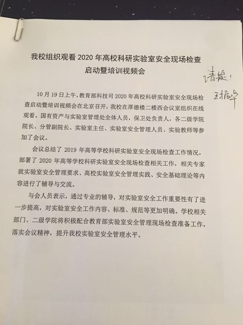 坐标网讯 10月19日上午,教育部科技司2020年高校科研实验室安全现场检查启动暨培训视频会在北京召开,beat365在厚德楼二楼西会议室组织在线观看。国有资产与实验室管理处全体人员,保卫处负责人,各二级学院院长、分管副院长、实验室主任、实验室安全管理人员、实验教师等参加了会议。会议总结了2019年高等学校科研实验室安全现场检查工作情况,部署了2020年高等学校科研实验室安全现场检查相关工作,相关专家就实验室安全管理要...